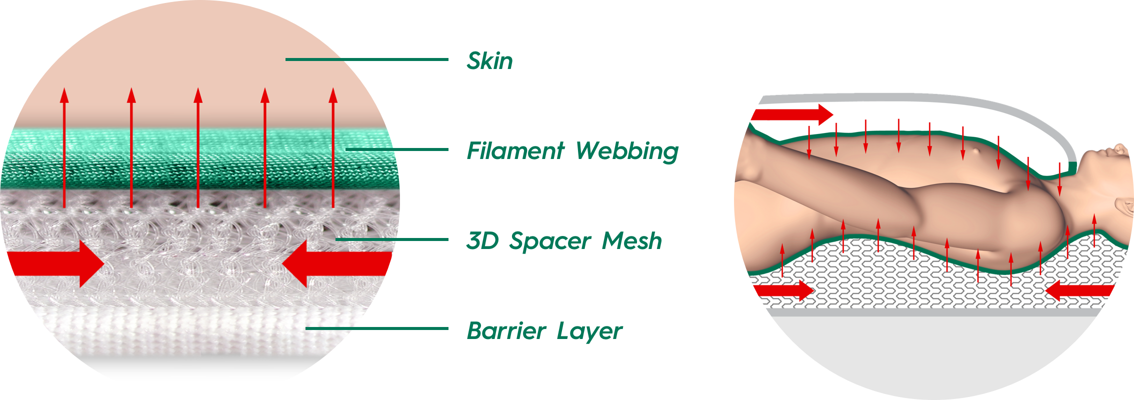 The integrated layer of 3D spacer fabric reduces interface pressure and minimises fluid accumulation on the surface of the warming mat.